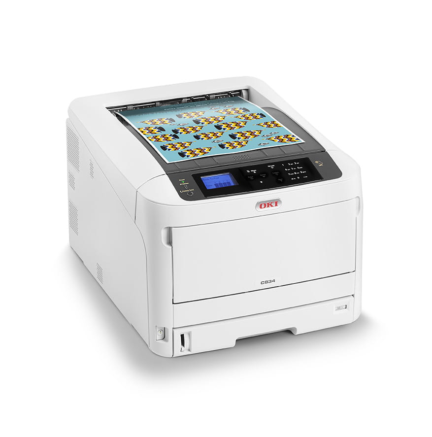 Dzięki zastosowaniu technologii szybkiego utrwalania OKI, kompaktowe urządzenie C834 jest bardzo wydajne i energooszczędne, co czyni je idealnym rozwiązaniem dla aktywnych firm i grup roboczych. Duża szybkość druku i wysoka jakość kolorowego druku na żądanie na szerokiej gamie nośników od arkuszy A6 po banery o długości 1,3 m oraz kartony o gramaturze 256 g/m sprawiają, że C834 to doskonała drukarka dla grup roboczych i firm, które chcą zrealizować więcej zadań za pomocą jednego urządzenia.