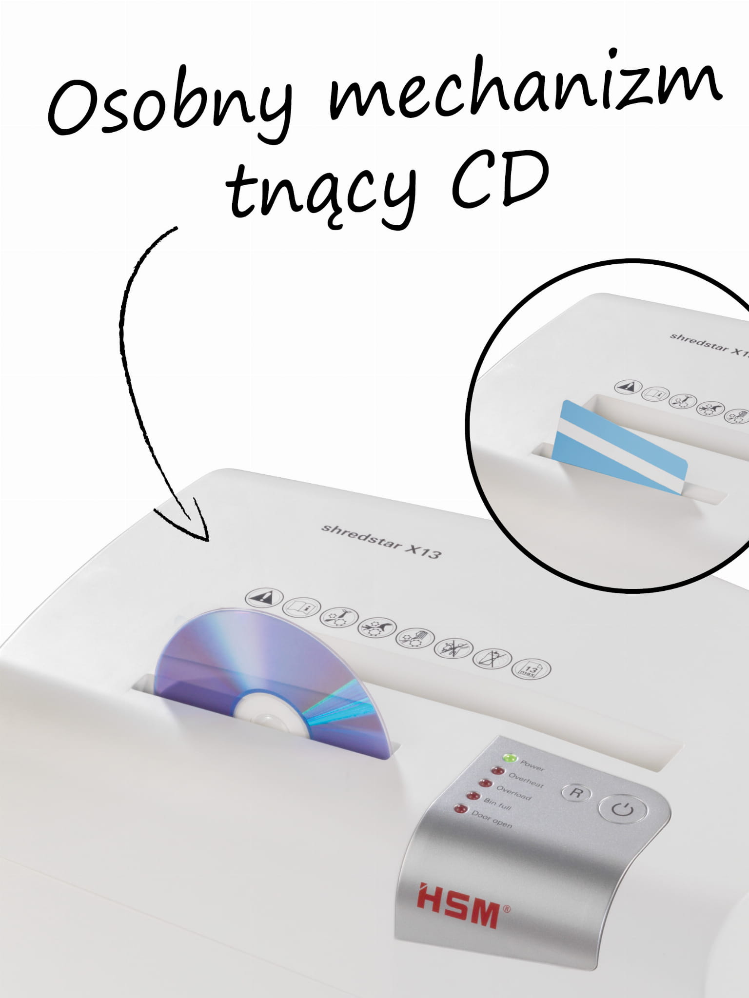 - Oddzielny mechanizm tnący płyty CD z pojemnikiem na ścinki umożliwiającym segregację odpadów.