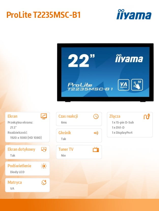 IIYAMA 21,5'' T2235MSC-B1 DOTYK HDMI/DVI/10P