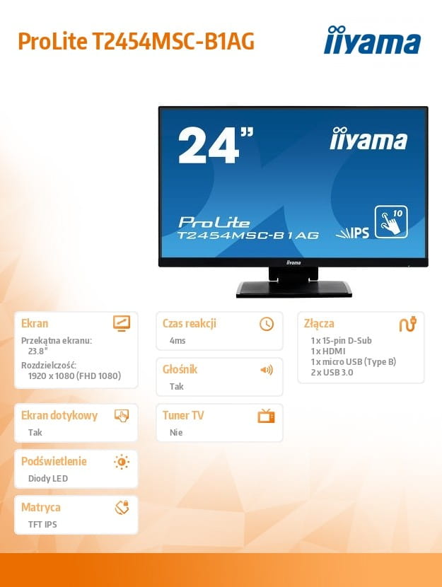 iiyama T2454MSC-B1AG to 24-calowy monitor Full HD multi-touch wykorzystujący technologię pojemnościową i wyposażony w gwarantującą doskonałe odwzorowanie kolorów i szerokie kąty widzenia matrycę w technologii IPS dodatkowo wzbogaconą o zapewniającą doskonałą czytelność obrazu w mocno oświetlonych lub nasłonecznionych pomieszczeniach powłokę antyrefleksyjną. Konstrukcja monitora opiera się na solidnej stopie zapewniającej szeroki zakres regulacji położenia ekranu. iiyama T2454MSC-B1AG doskonale sprawdzi się w szeregu zastosowań związanych z obsługą wymagających interaktywnych aplikacji.