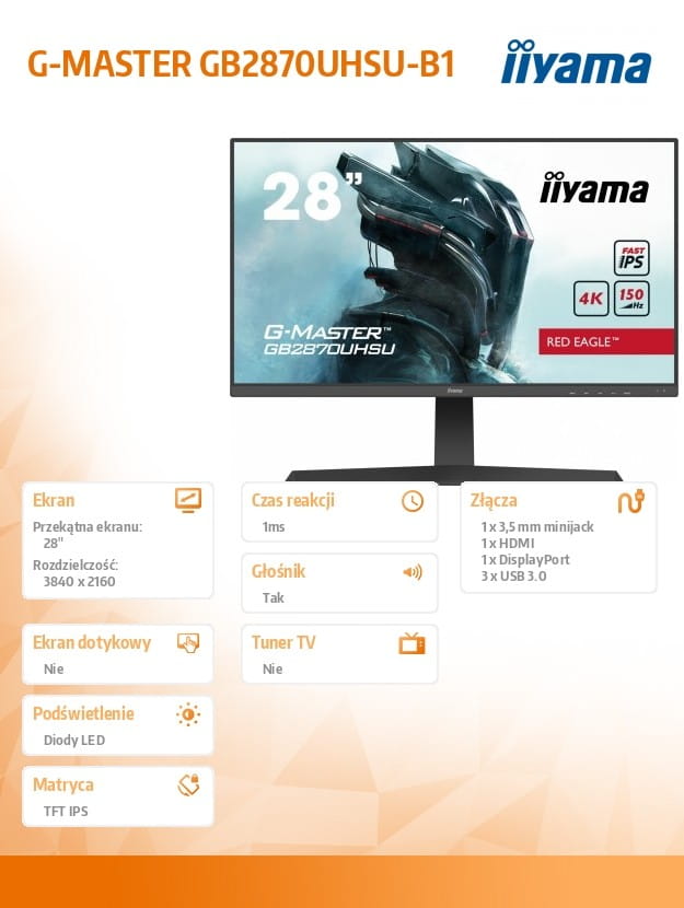 IIYAMA Monitor 28 cali GB2870UHSU 4K, HDMI, DP, 150Hz, USB3.0, HAS, HDR400, 2x2W