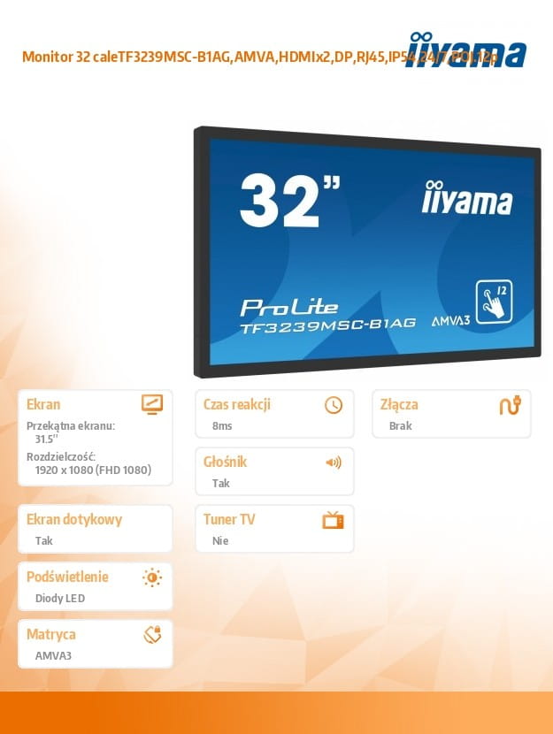 IIYAMA Monitor 32 cale TF3239MSC-B1AG,AMVA,HDMIx2,DP,RJ45,IP54,24/7,POJ.12p