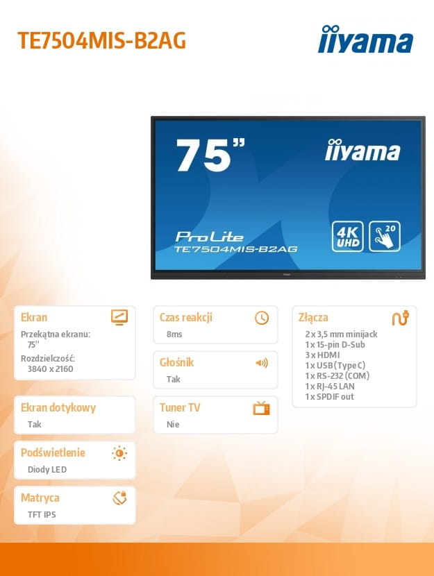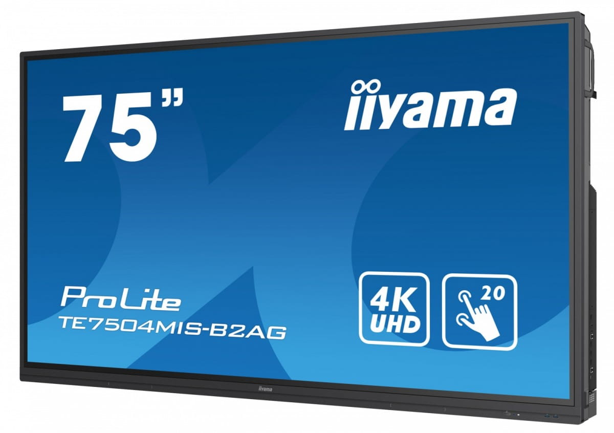 iiyama TE7504MIS-B2AG to panel stworzony z myślą o edukacji I biznesie. Użytkownicy mają do swojej dyspozycji 20 punktów dotykowych PureTouch -IR i zintegrowane oprogramowanie iiWare 9.0 (Android OS) obejmujące: aplikację Note umożliwiającą wprowadzanie notatek na plikach otworzonych bezpośrednio z nośnika USB podłączonego do ekranu lub wewnętrznej pamięci (32GB) samego wyświetlacza, przeglądarkę sieci WWW, system zarządzania plikami, aplikację do obsługi dostępu do dysku w chmurze, pakiet WPS Office i aplikację ScreenSharePro. Panel umożliwia również odtwarzanie prezentacji, plików wideo, zdjęć, slajdów, plików tekstowych praktycznie w każdym formacie. Teraz z dodatkowym złączem USB-C, które obsługuje najnowsze sygnały wideo, audio i dotykowe przez jeden port, a także zasila urządzenie mocą 65W.