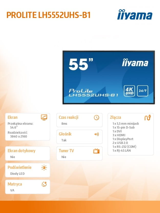 IIYAMA Monitor wielkoformatowy 54.6 cala LH5552UHS-B1 4K,24/7,SDM,IPS,ANDROID,500cd,DaisyChain