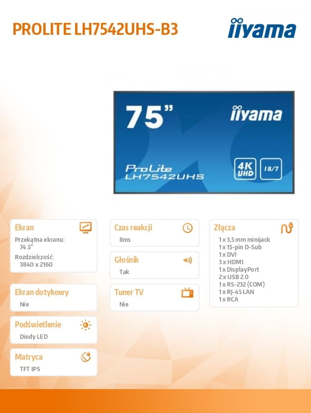 IIYAMA Monitor wielkoformatowy 74.5 cala LH7542UHS-B3 4K,18/7,SDM,IPS,LAN,PION,500cd/m2,OS8.0