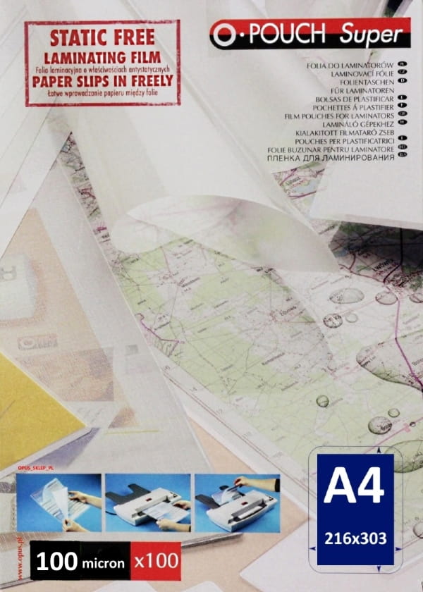Opakowanie 100 kieszonek profesjonalnej folii do laminowania Opus O.POUCH SUPER w rozmiarze: