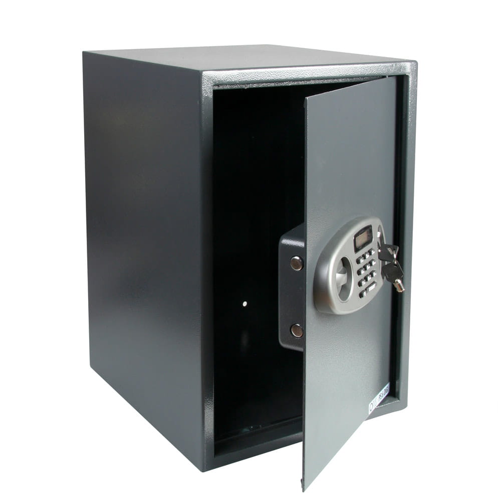 Metalowy sejf w kolorze ciemnoszarym wyposażony w zamek ryglowy otwierany szyfrem. Możliwe awaryjne otwarcie poprzez klucz. W zestawie cztery solidne kołki rozporowe typu kotwa.