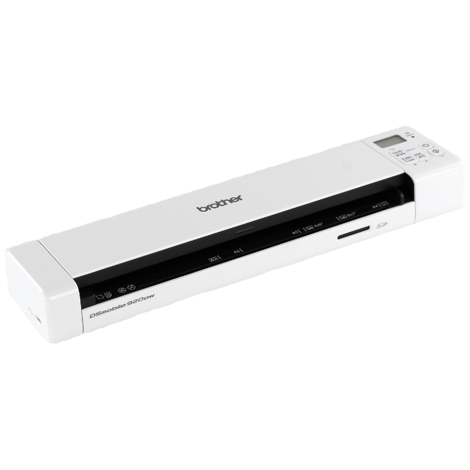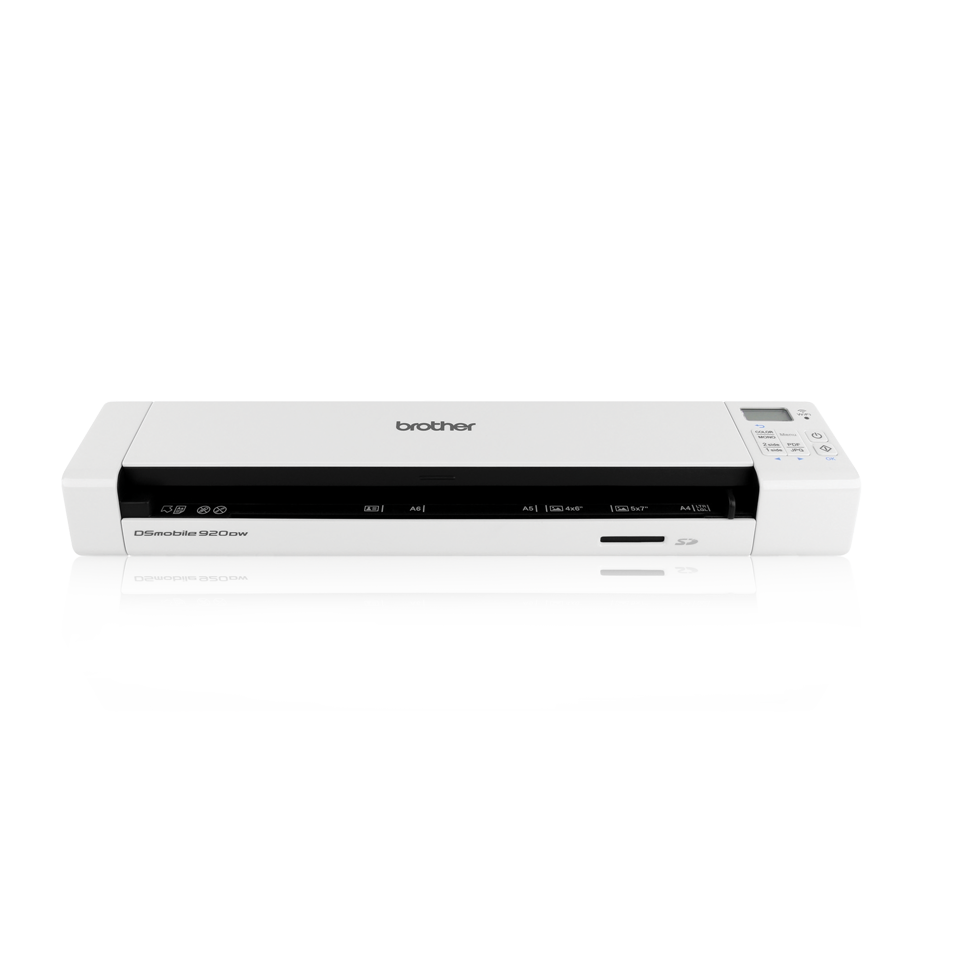 DS-920DW to elegancki, funkcjonalny i poręczny skaner bezprzewodowy dla osób, które skanują dokumenty z dala od biura. Model wyróżnia się wysoką jakością skanowania, wynoszącą do 1200 x 1200 dpi, funkcją skanowania dwustronnego oraz intuicyjną obsługą. Urządzenie posiada wbudowany moduł łączności bezprzewodowej i może być zasilane za pomocą akumulatora Li-ion lub kabla USB. Skany wykonane za pośrednictwem DS-920DW mogą być umieszczane na karcie SD (model dostępny jest w komplecie z kartą o pojemności 4GB) lub – drogą bezprzewodową – na urządzeniach mobilnych i komputerach. DS-920DW charakteryzuje się kompaktową konstrukcją: waży zaledwie 530 g, a jego wymiary to: 41,2 mm wysokości, 66,9 mm głębokości i 308 mm szerokości. Skaner jest kompatybilny z systemami Windows, Mac