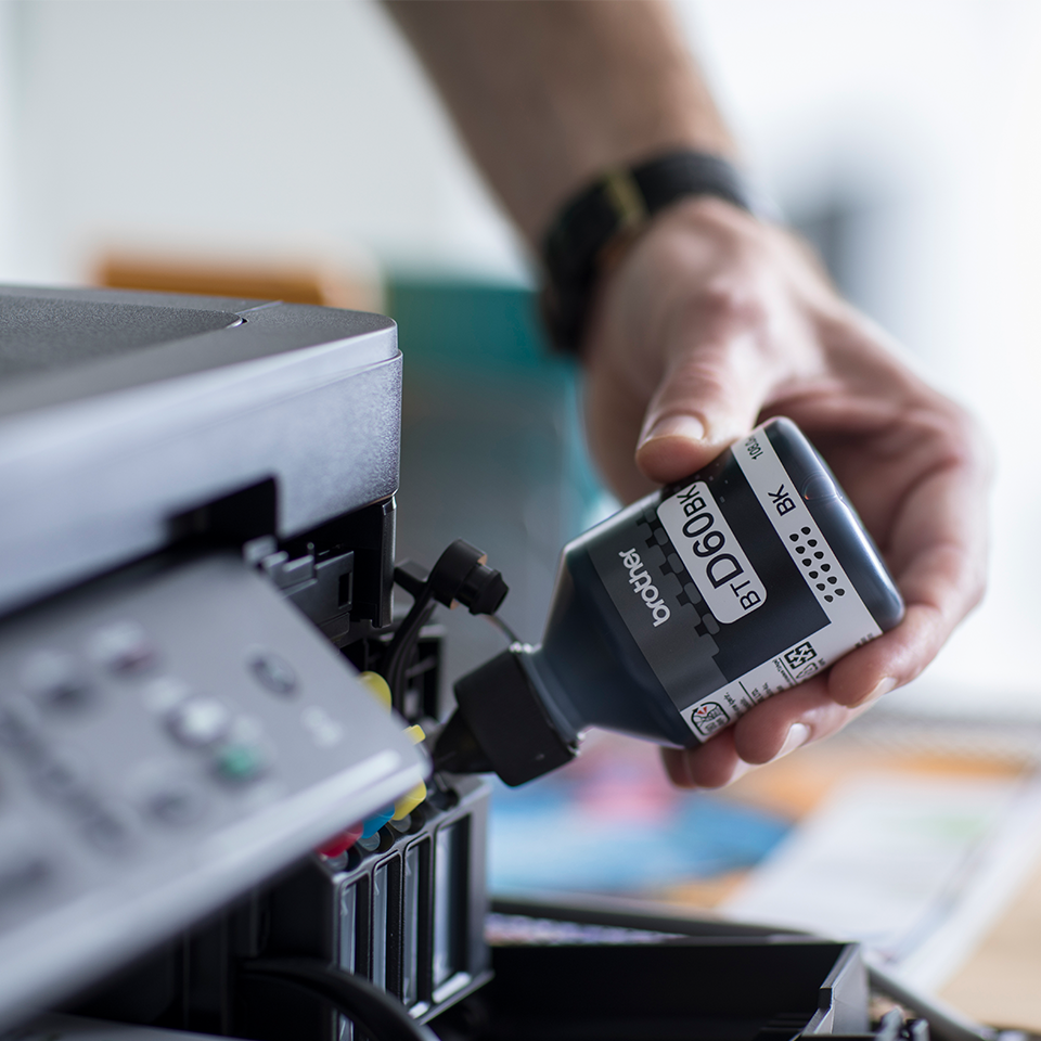 Tusz Brother BTD60BK został zaprojektowany tak, aby idealnie współpracować z naszymi urządzeniami i drukować dokumenty w wysokiej jakości za każdym razem gdy tego potrzebujesz. Wysoka wydajność butelki - do 6500 stron - zapewnia rzadsze uzupełnianie pojemników tuszem.